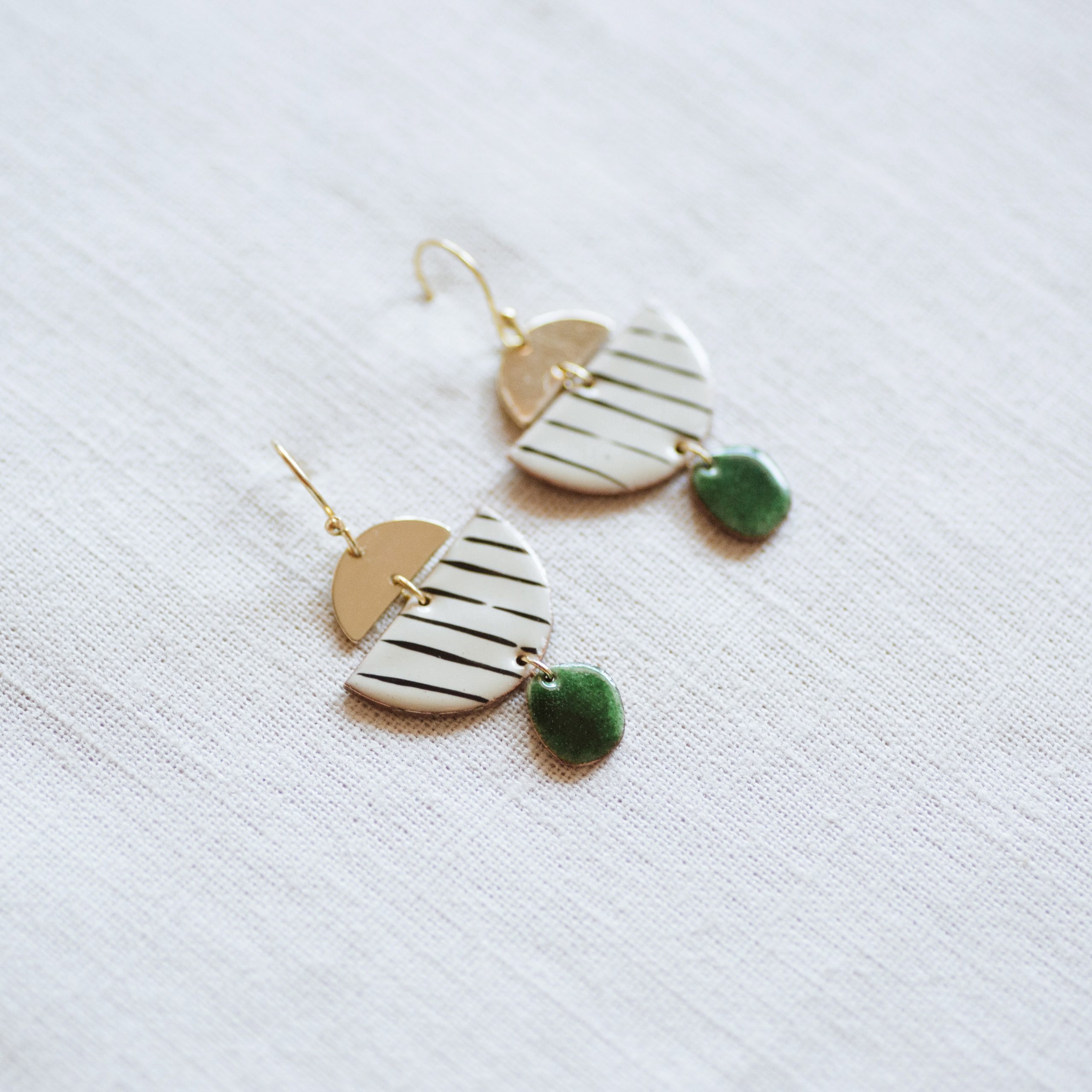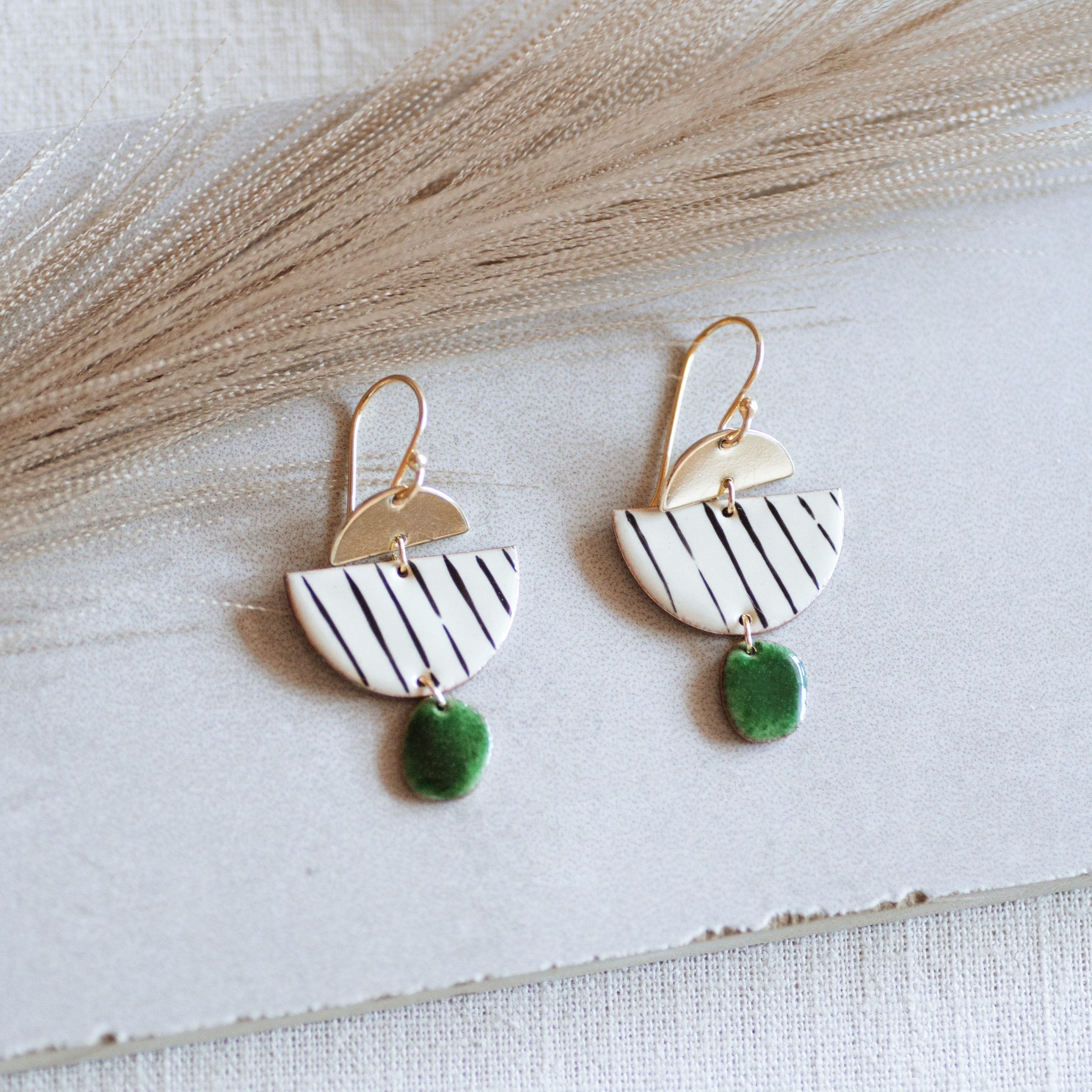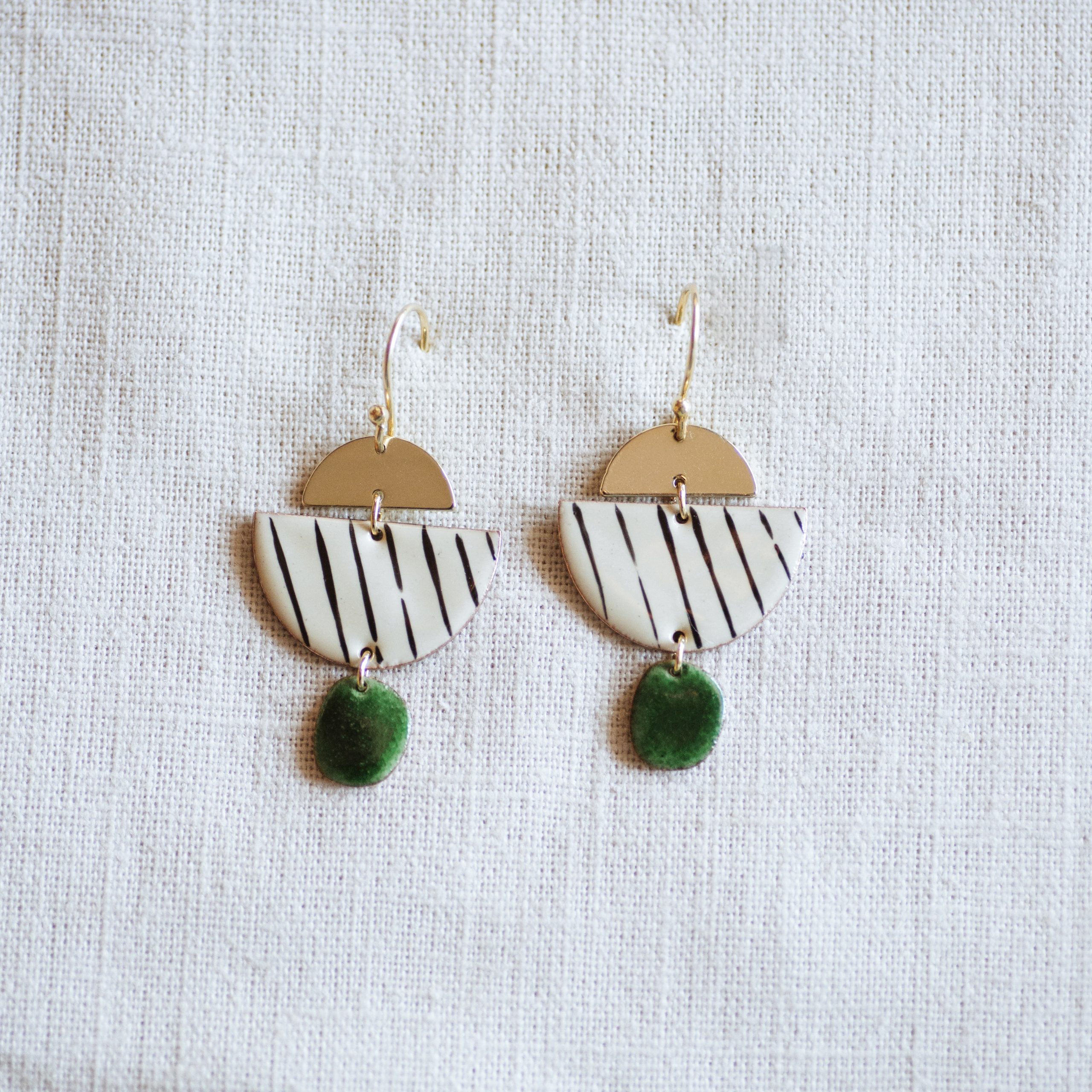 Pendiente de tres piezas, la primera en dorado, la segunda es un semicírculo de cobre esmaltado en base marfil y líneas vitrificadas negras y por ultimo circulo verde botella.